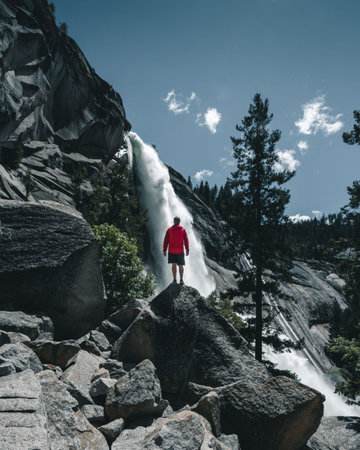 An adventurous guy standing in front of a huge waterfall in the Yosemite Valley. People who adventure.