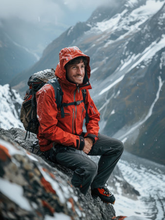 A smiling hiker wearing a bright red waterproof jacket is seated on rocky terrain with snowy mountains in the background