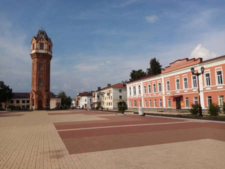 Lenin High street and Cathedral and of Assumption of Virgin Mary with Bell tower and monastery of the greyfriars, Pinsk Belarus October 16 2020.
