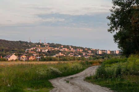 Spring evening landscape outside the city before the rain.
