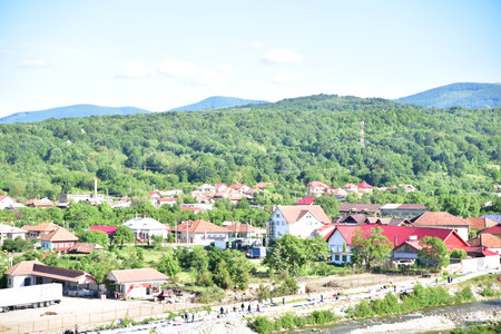 View from the stone walls at the Rupea Citadel (Cetatea Rupea) after renovation towards a small town in Brasov county, in the southern part of Transylvania (Transilvania) region, Romania in summer