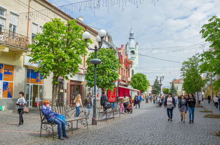 Beregovo, Ukraine - October 18, 2019: The central square and the street of the city, there is old architecture and many tourists.