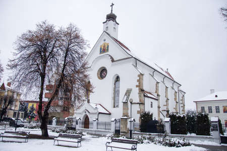 Khust Maidan Nezalezhnosti Independence Square with Saints Cyril and Methodius Cathedral at Background