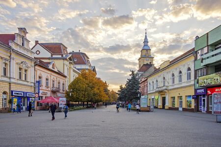SUBOTICA, SERBIA - MARCH 28, 2019: People walking and sitting on the pedestrian street of Korzo, the main avenue of the center of Subotica, one of the main cities of Voivodina province.