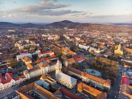 Evening view from above on Beregovo. Central square and beautiful evening sun. Ukraine.