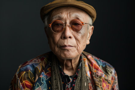 Elderly Chinese man looks youthful in studio portrait, wearing trendy clothing and accessorized with sunglasses and a cap.