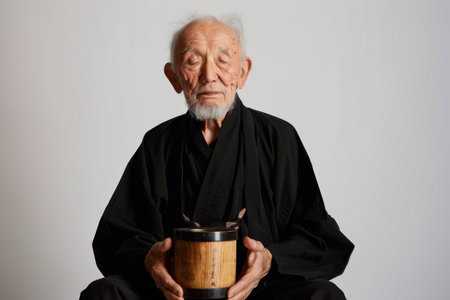 an elderly Japanese man praying with a prayer wheel: He sits with a prayer wheel in his hands, eyes closed in concentration on a white studio backdrop