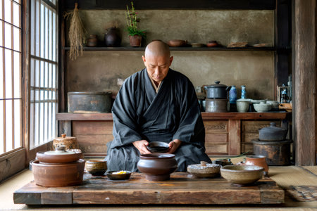 Japanese Buddhist monk wearing kimono sitting on floor in traditional tea room, holding small bowl during tea ceremony