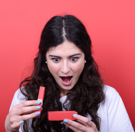 Portrait of happy woman opening gift box against red background
