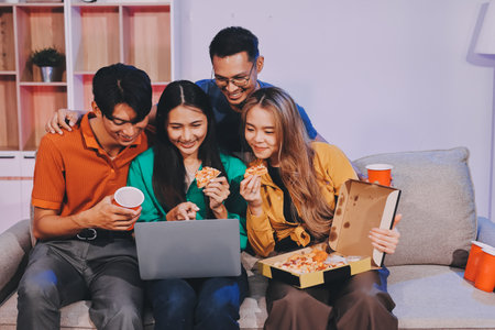 Happy young friends group having lunch at home. Asia family party eating pizza food and laughing enjoying meal while sitting at dining table together at house. Celebration holiday and togetherness.