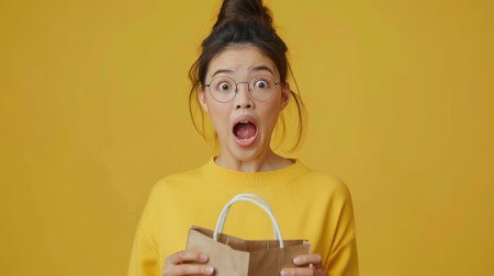 Excitement fills the air as a young person reacts in surprise to a gift box against a bright yellow background
