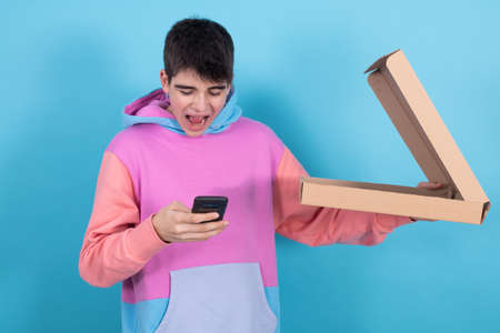 young teenage man with pizza box or fast food and mobile phone isolated on color background