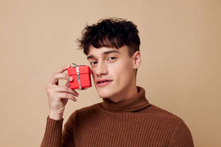 portrait of a young man stylish hairstyle brown turtleneck gift box isolated background unaltered
