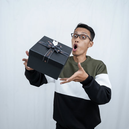 An Asian young man with glasses with a surprised happy expression getting a surprise gift. Isolated on a white background.