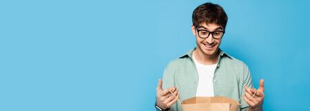 horizontal crop of surprised young man looking into shopping bag on blue