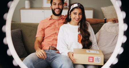 Couple, ring light and box with live stream in home, smile and portrait with post on web in lounge. Influencer, man and woman with unboxing video, recording and happy with social media at apartment