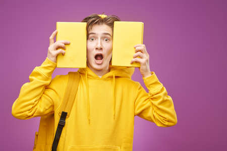 A modern teenager in bright youth clothes with a backpack holds books looking with surprise and sadness into the camera. Purple background. Educational concept.