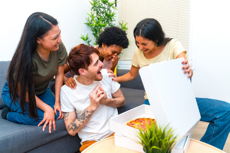 Happy and hungry young multi-ethnic friends receiving a delivery pizza