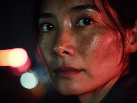 Portrait of a person with a serious expression, illuminated by red and blue lights. The face has natural freckles, with hair partially visible. The play of light creates a moody atmosphere