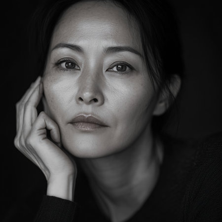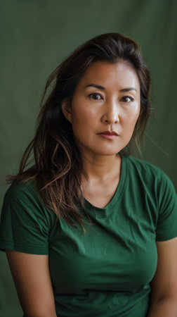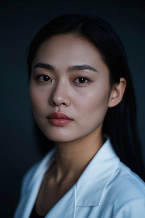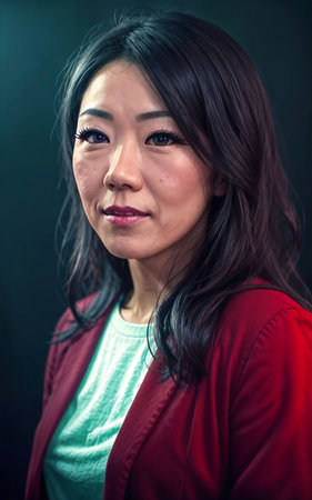 portrait photo of beautiful middle aged asian woman in dark room with light in background, generative AI