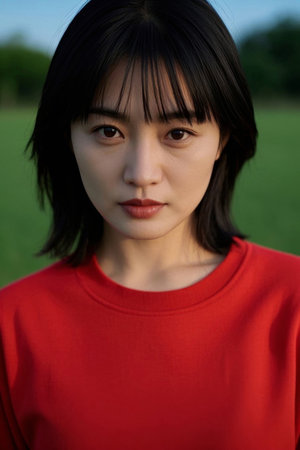 A young woman with dark hair looks intensely into the camera, her brown eyes filled with determination
