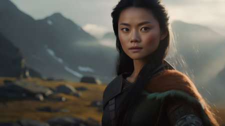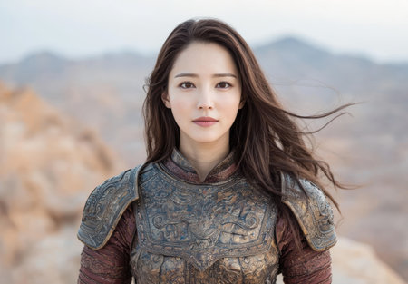 A confident woman with dark hair and silver armor strikes an action-ready pose, standing in a natural landscape. The wind in her hair and determined expression emphasize her strength and agility.