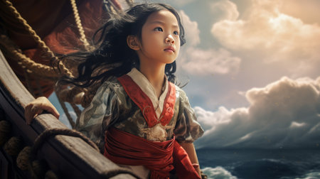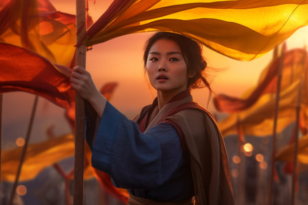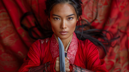 Portrait of a beautiful asian woman with long black hair in traditional clothes