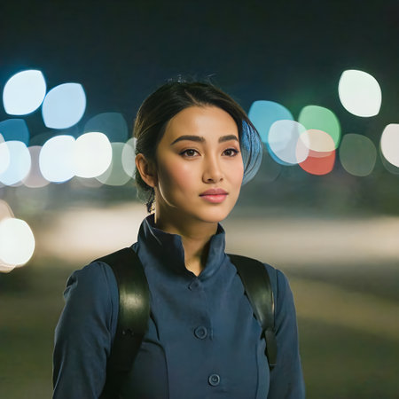A young woman 25 years old urban setting, with warm, glowing light in the background highlighting her features as the sun sets. Fashionable serious brunette. A resident of Kazakhstan. AI generated