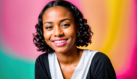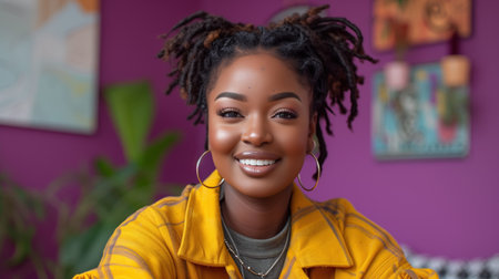 Radiant African American woman with dreadlocks smiling in a trendy yellow jacket against a vibrant purple background.