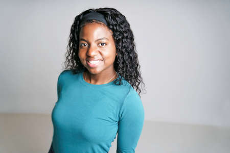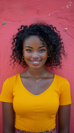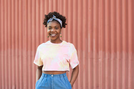 Portrait of African young woman smiling at camera while standing outdoors against the wall