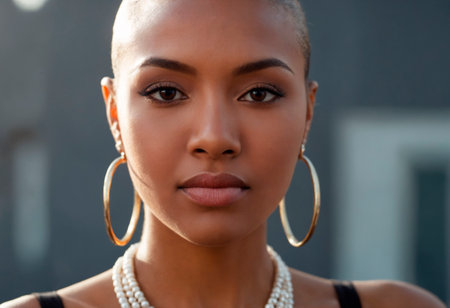 Portrait of a beautiful bald young African American woman in close-up with clean fresh skin.
