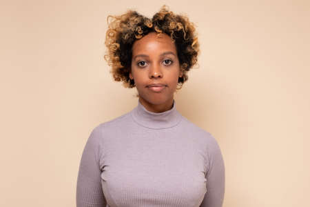 Close up portrait of real African American woman looking at camera while posing against neutral background in studio with focus on skin imperfections, copy space