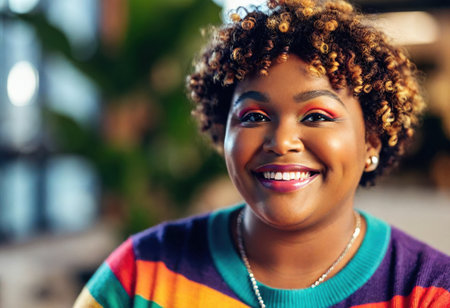 A joyful woman with curly hair is wearing colorful clothing while engaging with viewers.