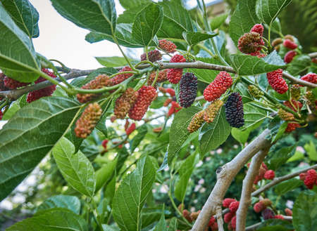 Mulberry fruit and tree. Black ripe and red unripe mulberries tree on the branch