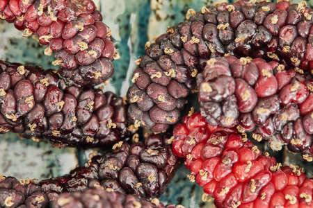 Afghan mulberry black and red lying on plate, close-up