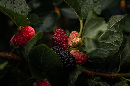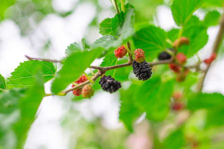black ripe and red unripe mulberries on the branch in mulberry garden.