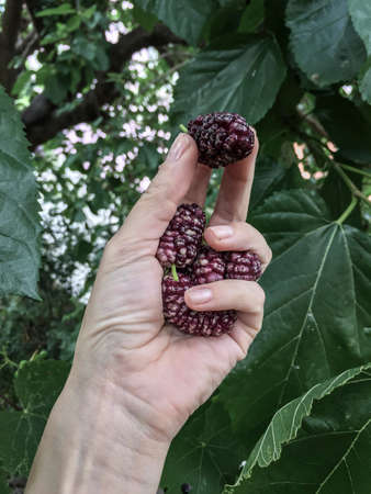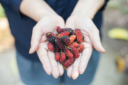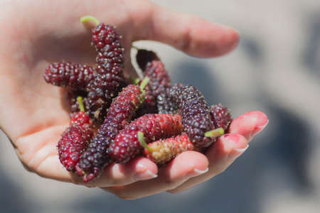 Some ripe mulberry fruit on palm of a woman