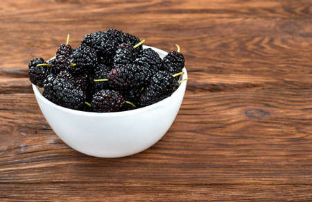 Ripe mulberries on white a dish on wooden table. Tasty berry with copy space for text. Top view. Concept of healthy fruit.
