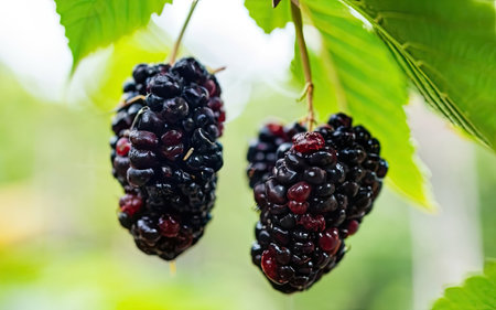 colorful fresh Black Mulbeery on tree close up