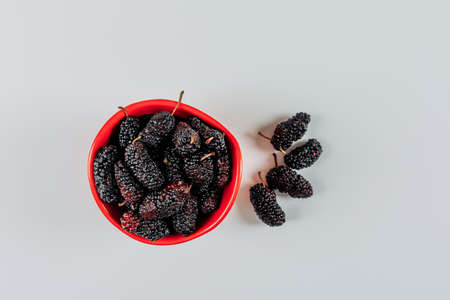 Mulberries in a bowl and on a white background. top view.