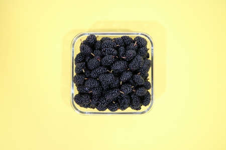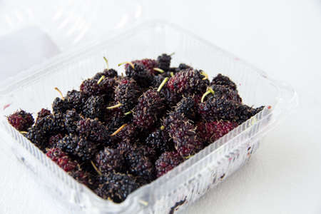 Black ripe mulberries in plastic box for sale in market