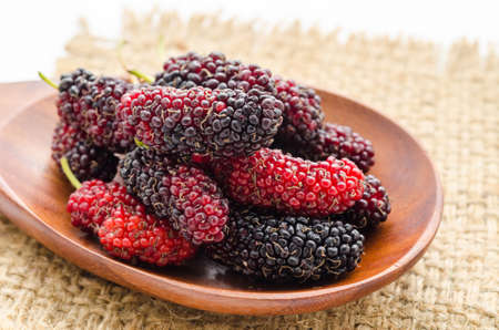 Fresh mulberry in wooden spoon on sack