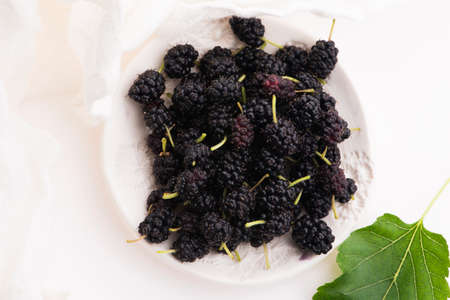 Beautiful mulberry berries in a white plate
