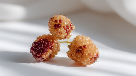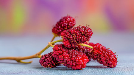 Close-up of vibrant red mulberries showcasing their unique texture. This image captures the essence of fresh, organic berries against a beautifully blurred background.