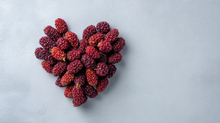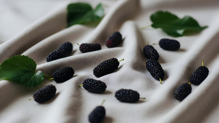 This stunning image features fresh ripe mulberries arranged artfully, showcasing their natural beauty and texture against a soft background, perfect for culinary projects.