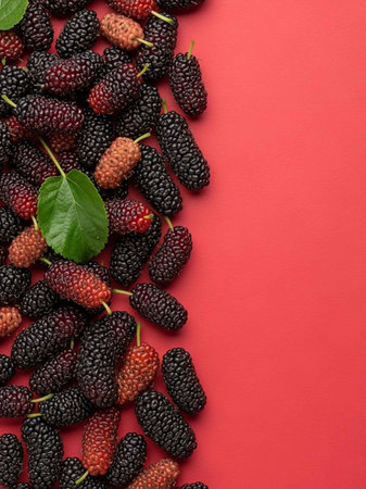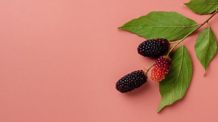 Discover the beauty of freshly picked mulberries showcased against a soft pink background. This composition captures the vibrant colors and rich textures of natural fruits.