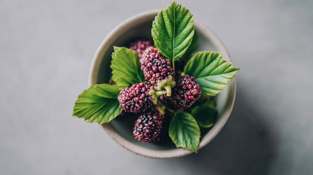 A beautiful arrangement of fresh mulberries resting in a simple bowl, complemented by lush green leaves. Ideal for depicting healthy living and nature