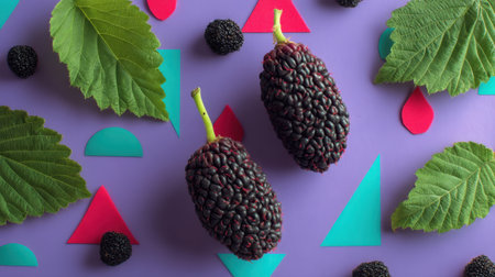 This vibrant arrangement features fresh black mulberries on a purple backdrop, complemented by green leaves and geometric shapes, perfect for creative projects and food styling.