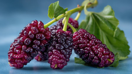 Discover the beauty of fresh mulberries displayed against a blue backdrop. This image captures the fruit's unique texture and rich color, ideal for health-focused content.