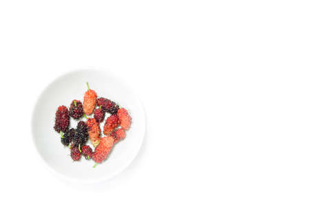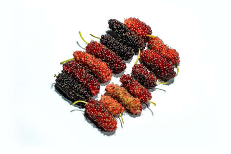 Ripe mulberry (Morus) is black and red on white background healthy mulberry fruit food isolated